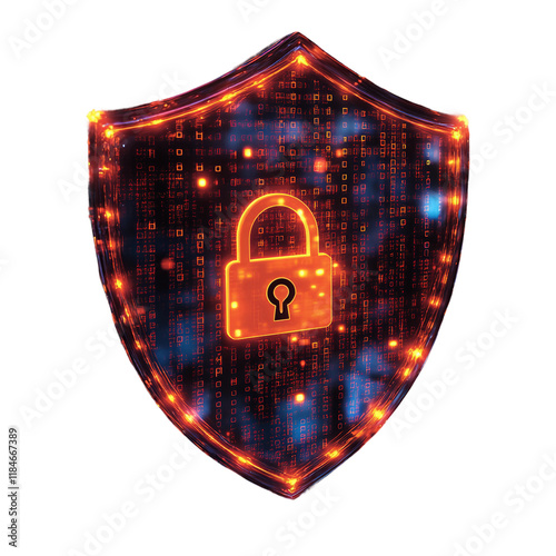 A transparent digital shield with floating binary codes and glowing lock icons, symbolizing advanced cybersecurity, Cybersecurity Data Shield on a transparent background,