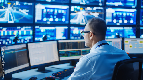 a transportation coordinator in a smart city control center managing traffic data on multiple digital displays, technology, smart city, innovation,