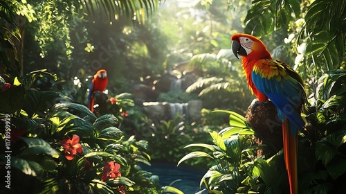 A tropical rainforest garden with dense vegetation and colorful parrots perched nearby