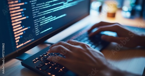 A user coding on a computer with programming scripts visible on the screen during evening hours in a dimly lit room
