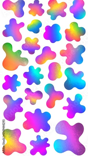 A vertical arrangement featuring various amorphous shapes in a spectrum of rainbow hues, blending seamlessly. These shapes sit on a white background