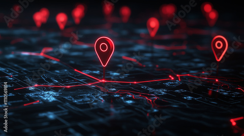 A vibrant 3D map featuring glowing red location pins connected by dynamic network lines, representing GIS mapping and spatial data visualization