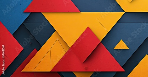 A vibrant abstract composition featuring overlapping geometric shapes in red, yellow, and blue, creating a dynamic visual effect.