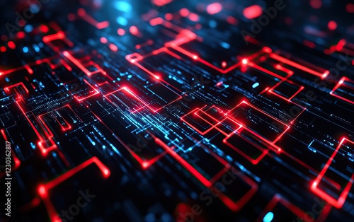 A vibrant, abstract digital landscape features glowing red and blue lines, creating a futuristic network of interconnected paths.