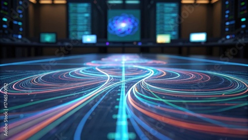 A vibrant, abstract representation of data flow in a high-tech environment, emphasizing intricate patterns and illuminated pathways.
