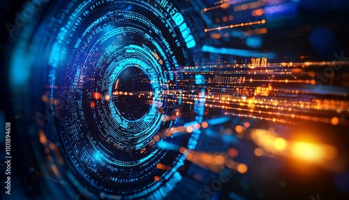 A vibrant, abstract representation of digital data flow, featuring circular patterns and bright, glowing particles suggesting speed and technology.