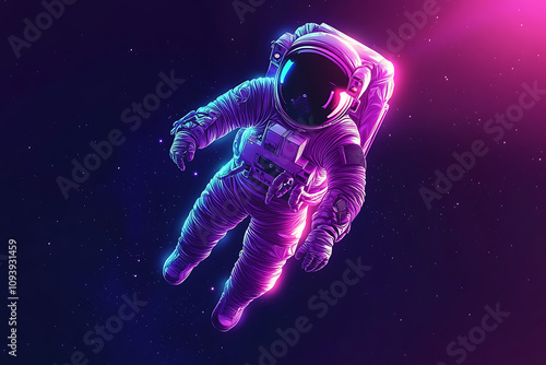 A vibrant astronaut floats in space, illuminated by neon colors against a dark backdrop.