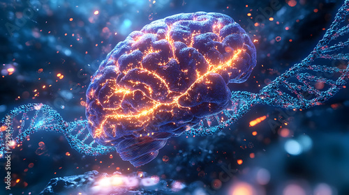 A vibrant brain intertwined with DNA strands, symbolizing intelligence.