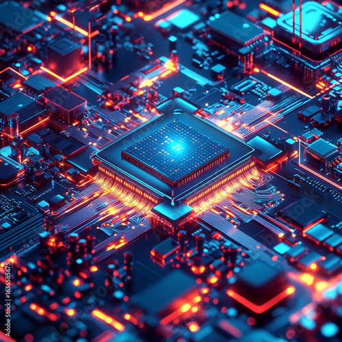 A vibrant close-up view of an illuminated electronic circuit board reveals intricate patterns of glowing data pathways and advanced computing components.