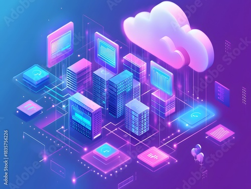 A vibrant cloud computing landscape featuring digital buildings and interactive data patterns in a futuristic setting, ideal for illustrating modern technological advancements.