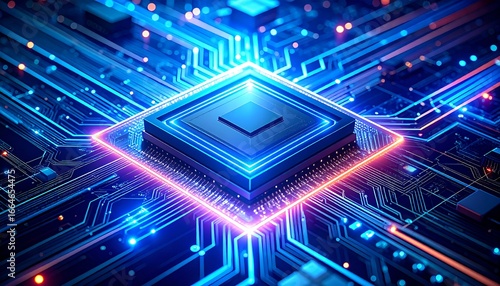 A vibrant, detailed close-up showcases a central processing unit (CPU) nestled within a complex circuit board, highlighted by radiant blue and pink glowing lines.