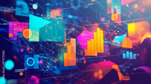 A vibrant digital display of data visualization, featuring abstract graphics, charts, and glowing geometric shapes, symbolizing analytics and technology.