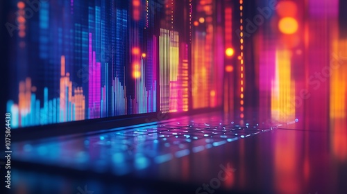 A vibrant digital display on a laptop showcasing data visualization with colorful bars and lights.