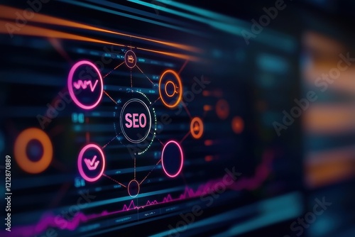 A vibrant digital interface showcasing SEO metrics with various icons representing analytics and data visualization.