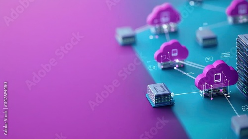 A vibrant digital network featuring pink cloud icons and data nodes, representing cloud computing and modern technology.
