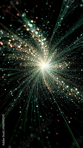 A vibrant explosion of colored light particles radiating from a central point in a dark cosmic background