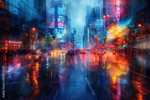 A vibrant image of a neon-lit cityscape during rain at night. The bustling traffic and colorful reflections on the wet streets create a lively urban scene reminiscent of modern nightlife.