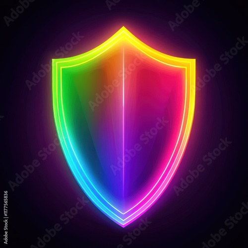 A vibrant, multicolored shield glowing in neon hues against a dark background.