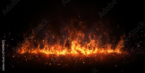 A vibrant row of fire flames and bright sparks on a dark background
