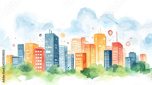 A vibrant watercolor illustration depicting a city skyline with colorful buildings against a bright sky and lush greenery, showcasing urban life.