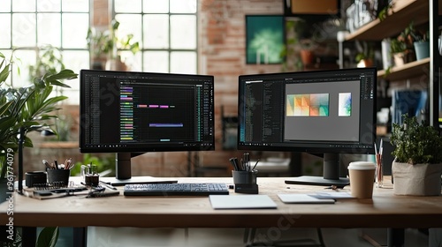 A vibrant workspace with dual monitors showing a graphic design software interface, a sketchpad, and a coffee cup beside, hinting at a productive designers desk.