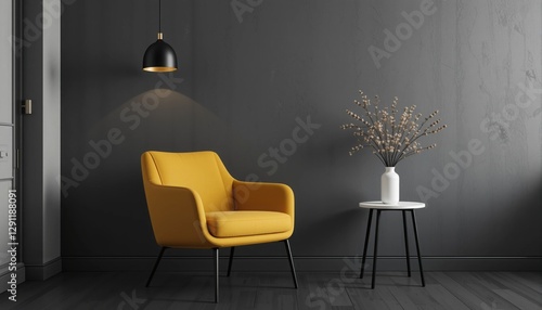 A vibrant yellow chair stands alone against a dark wall, illuminated by a stylish pendant light. A simple side table and a delicate vase complete this serene, contemporary nook