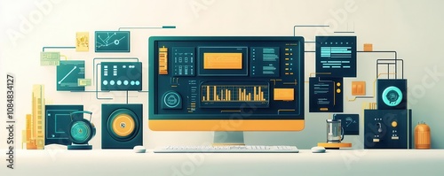 A visually engaging digital interface displaying various data visualizations and control panels, emphasizing technology and analytics.