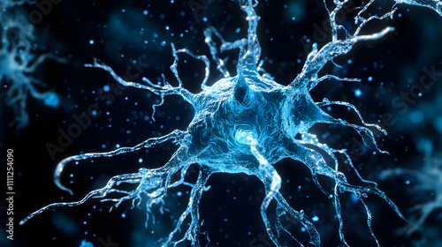 A visually striking abstract image resembling a neuron structure exploding in blue hues against a deep black background