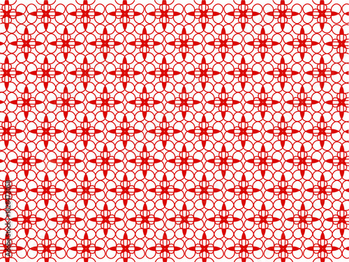 A warm and dinamic repeating pattern featuring a red gometric quatrefoil and circular lattice .