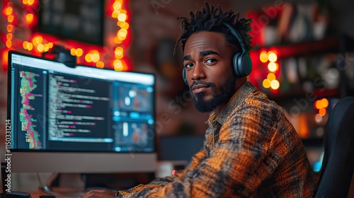 A web designer works from home, programming and ensuring cybersecurity for a startup; he writes code for a website or app, using headphones and the internet