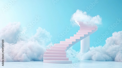 A whimsical pink staircase ascends through fluffy clouds against a bright sky, evoking a dreamy, surreal atmosphere.