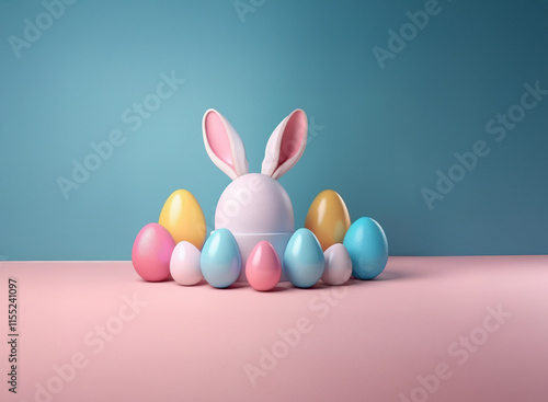 A white egg with bunny ears sits amidst pastel-colored Easter eggs on a pink surface against a teal background. A festive spring scene.