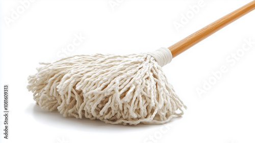 A white mop with a brown handle
