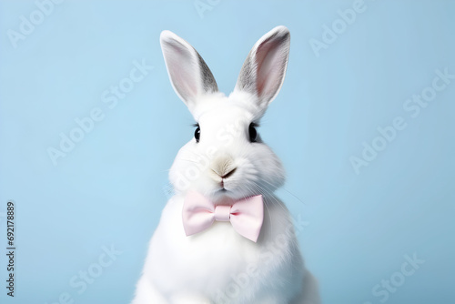 a white rabbit in a bow tie on a blue background, easter, magic