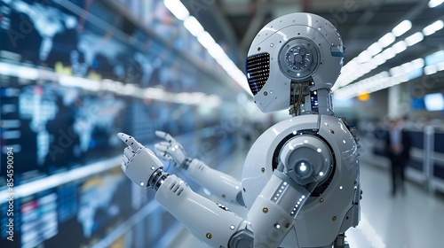 A white robot with a humanoid form interacts with a digital interface in a modern store setting