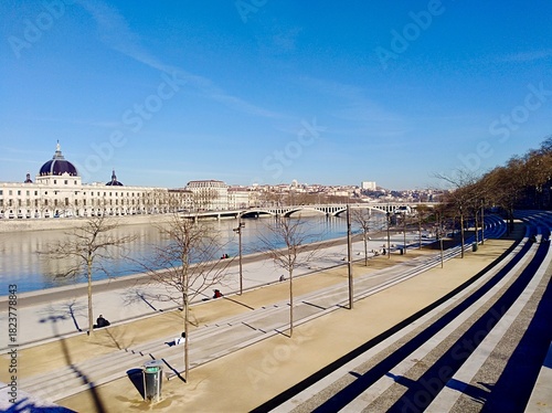 A wide-angle, sunlit view of the newly renovated Rhône river banks (Rives de Saône) in Lyon, featuring the iconic Grand Hôtel-Dieu building and a bridge over the tranquil river.