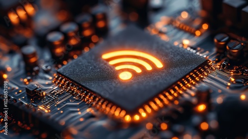 A WiFi symbol on a microchip, depicting data flows from the CPU across a futuristic motherboard, illustrating wireless technology advancements in a 3D render.