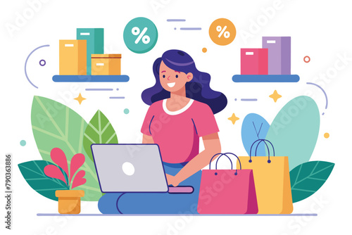 A woman is seated in front of a laptop computer, browsing and possibly shopping online, A woman buys things in an online store, online shopping, Simple and minimalist flat Vector Illustration