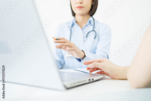 A woman is sitting at a desk with a laptop open in front of her. A doctor is standing behind her, looking at the laptop. The woman is typing on the laptop while the doctor looks on
