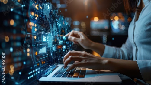 A woman is using a laptop computer with a futuristic user interface.