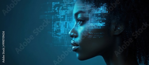 A woman's face is overlaid with blue digital code, symbolizing the intersection of technology and human intelligence.
