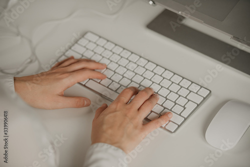 A workplace with an English keyboard. Close-up photo of woman’s hands typing on a wireless white keyboard. A girl working on a notebook. Aluminum laptop, headphones, keyboard, mouse.