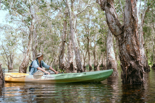A young Asian man travels alone in the jungle, paddling a boat and taking photos alone.
