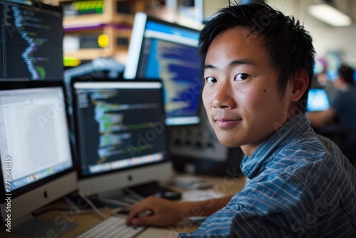 A young Asian programmer and network security professional working diligently in an office environment, surrounded by multiple computer displays