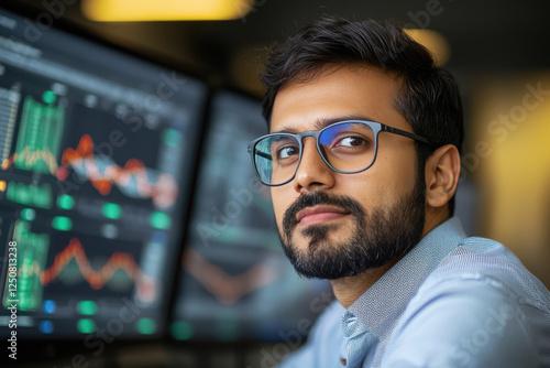 a young Indian software engineer developing climate prediction algorithms, sitting at a workstation with multiple screens displaying