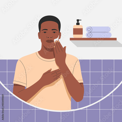 A young man is seen applying skincare cream in a contemporary bathroom, highlighting the importance of personal care and grooming in modern men's routines.
