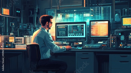 A young man sits in front of multiple computer screens in a dimly lit room. He is engrossed in his work, focused on the glowing screens. The scene is a mix of retro and modern technology