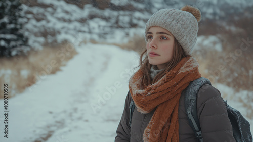 A young parson standing in softly falling snow