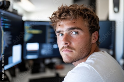 A young professional reflecting on intricate programming code, emphasizing the relationship between human creativity and the challenges of modern software development in tech spaces.