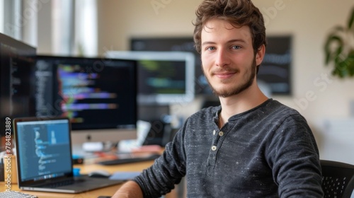 A young programmer smiling and looking to the camera